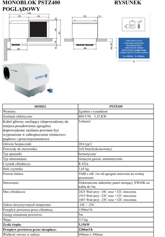 Agregat monoblok sufitowy mroźniczy do komory mroźniczej PSTZ400