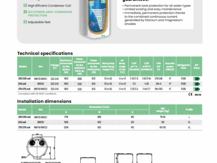 COP 3,70 dla tp20C, moc akustyczna 47 dBa, sterowanie wi-fi, wysposażony w króciec cyrkulacyjny, dostarczany z adapeterami do kanałów wentlacyjnych. Odnawialne, ekologiczne i ekonomiczne źródło ogrzewania wody