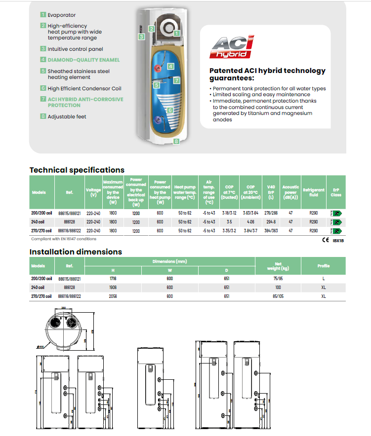 COP 3,64 dla tp20C, moc akustyczna 47 dBa, sterowanie wi-fi, wysposażony w króciec cyrkulacyjny, dostarczany z adapeterami do kanałów wentlacyjnych. Odnawialne, ekologiczne i ekonomiczne źródło ogrzewania wody
