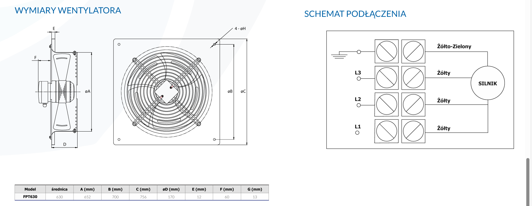 SPECYFIKACJA TECHNICZNA Model FPT630 Średnica (mm)630 Napięcie (V)400 Częstotliwość (Hz)50 Moc (W)570 Prąd (A)1,16 Obroty (RPM)1350 Przepływ powietrza (m³/h)8990 Ciśnienie powietrza (Pa)107 Pojemność kondensatora (μF/V)-Waga netto (kg)19 Waga brutto (kg)20 SILNIK